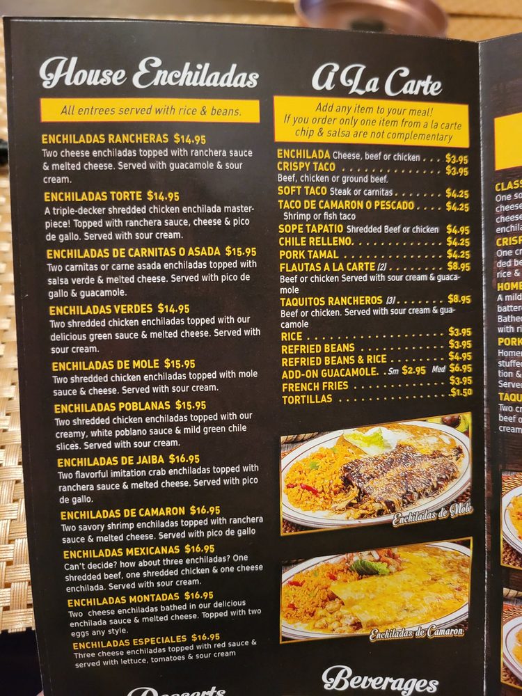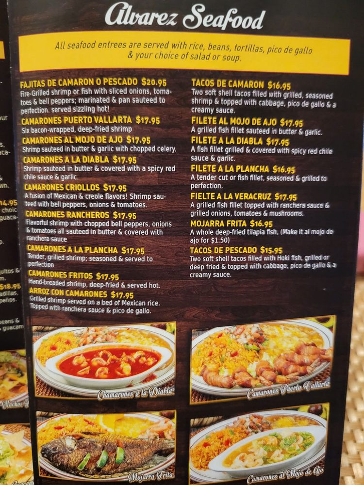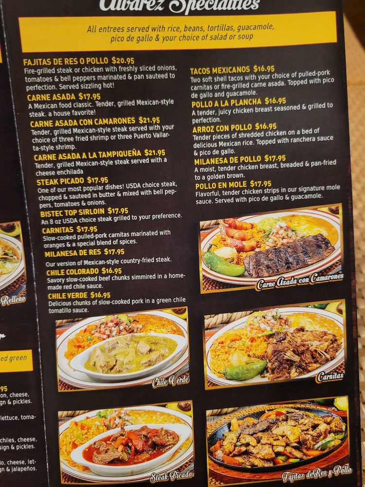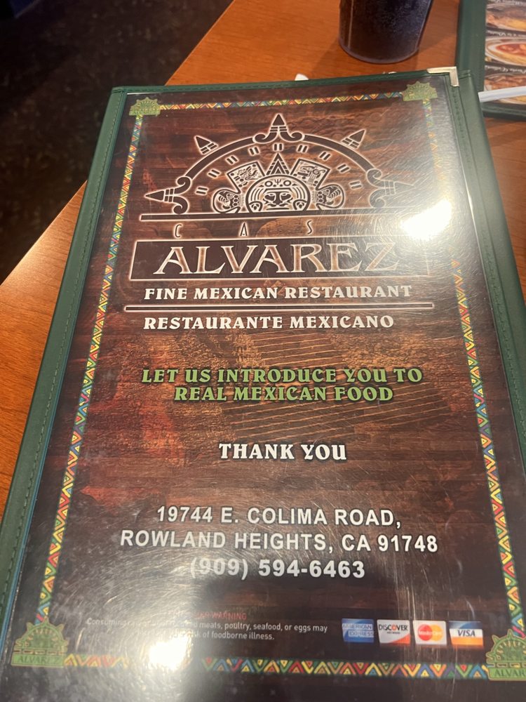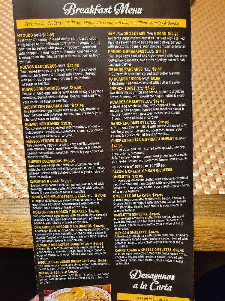 Introducing the menu at Casa Alvarez, located in Rowland Heights, CA. This Mexican restaurant offers a wide range of breakfast options, including Regular Vaqueros Breakfast, Bacon and Eggs, and French Toast. The Lil Vaqueritos Breakfast Menu features dishes like Quesadilla and Egg and Pancake, Egg and Bacon. For a la carte options, you can choose from One Egg, Any Style, Mexican-Style Potatoes, and more. Customers rave about the flavorful food, friendly service, and cozy atmosphere. Highlights include the Chile Rellenos and Enchiladas de Mole, known for their authentic flavors and generous portions. Whether you're craving a hearty breakfast or a satisfying dinner, Casa Alvarez is a must-visit for delicious Mexican cuisine.