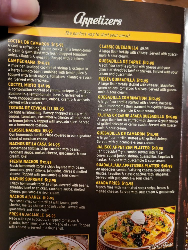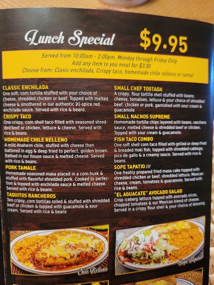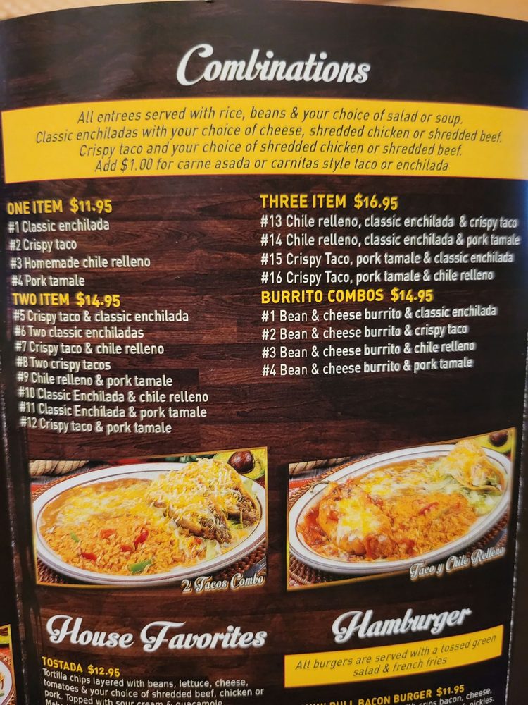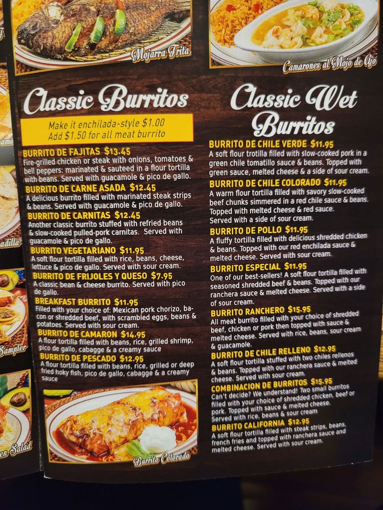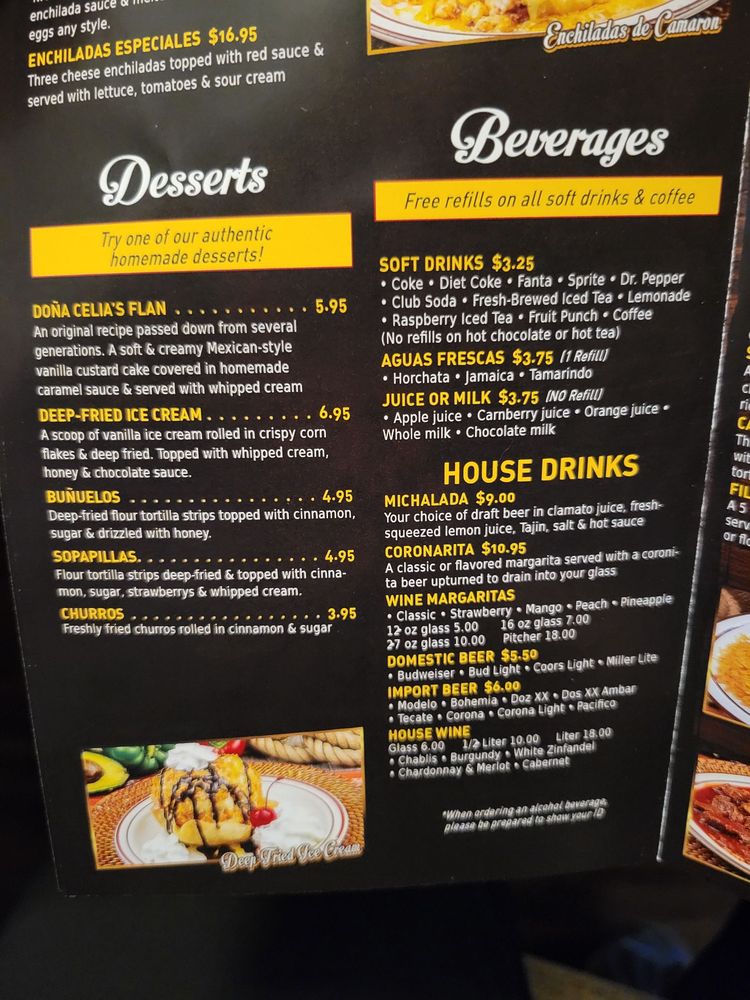 Introducing the menu at Casa Alvarez, located in Rowland Heights, CA. This Mexican restaurant offers a wide range of breakfast options, including Regular Vaqueros Breakfast, Bacon and Eggs, and French Toast. The Lil Vaqueritos Breakfast Menu features dishes like Quesadilla and Egg and Pancake, Egg and Bacon. For a la carte options, you can choose from One Egg, Any Style, Mexican-Style Potatoes, and more. Customers rave about the flavorful food, friendly service, and cozy atmosphere. Highlights include the Chile Rellenos and Enchiladas de Mole, known for their authentic flavors and generous portions. Whether you're craving a hearty breakfast or a satisfying dinner, Casa Alvarez is a must-visit for delicious Mexican cuisine.
