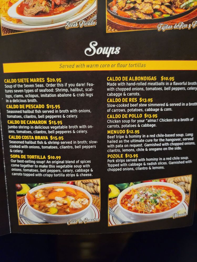 Beef triple and hominy in a red chille-based soup served with pata on request. Garnished with fresh onions, cliantro, lemons, crushed chile and oregana. Served with tortillas.